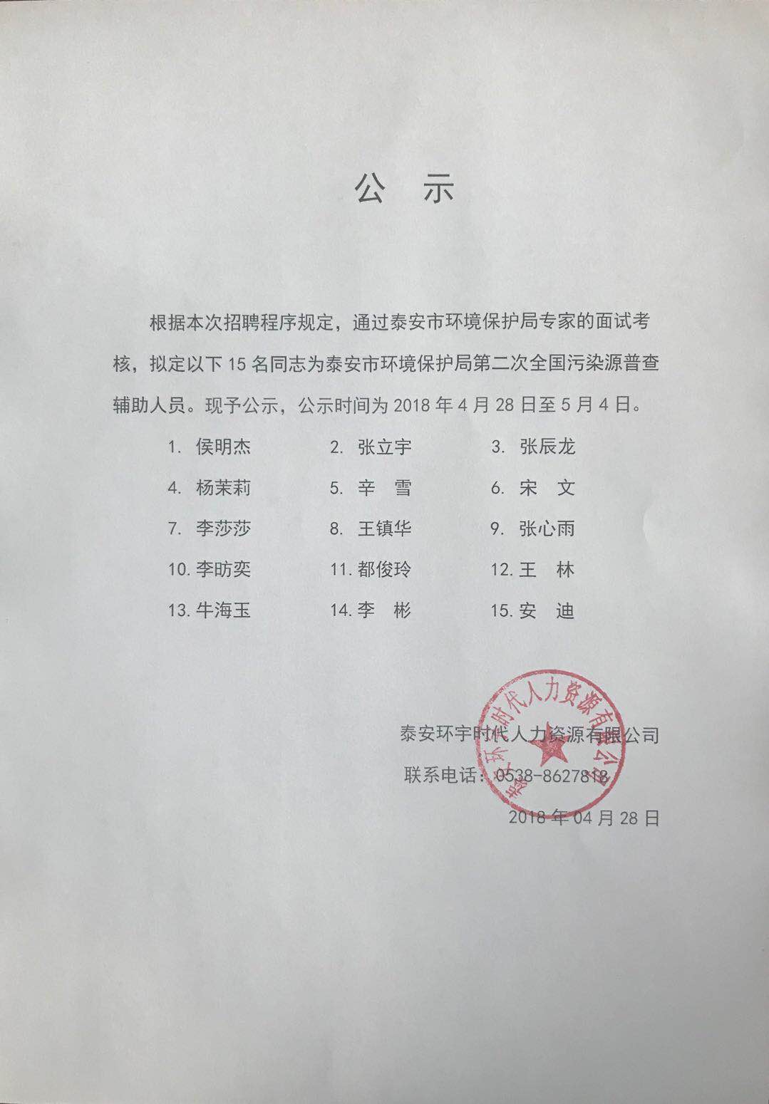 泰安市環境保護局第二次全國污染源普查輔助人員公示