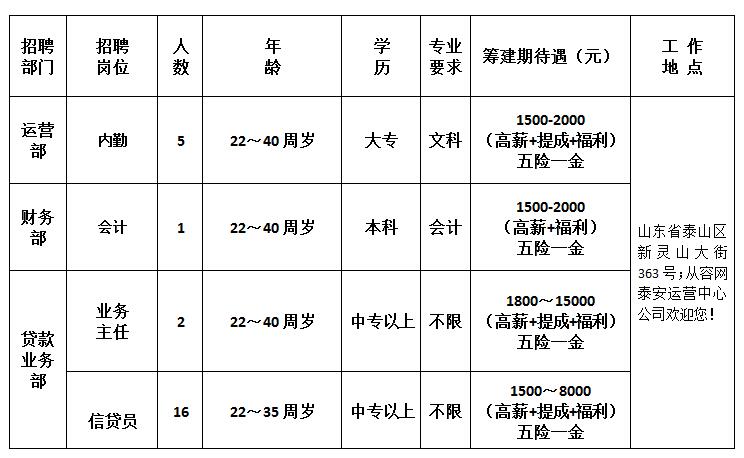 從容網是專業的互聯網金融信息服務平臺,為金融機構與貸款需求者提供安全的互聯網金融信息第三方線上服務,助力借貸雙方的信息互通與快速精準匹配。泰安運營中心因籌建需要,現面向社會公開招聘優秀管理干部、內勤、業務人員,統一培訓上崗。