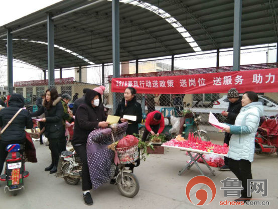 魯網泰安2月19日訊 為進一步促進農村勞動力轉移就業和農民工就業創業,2月18日,寧陽縣磁窯鎮利用春節期間開展就業扶貧政策宣傳的有利時機,精心籌劃、迅速布置,組織勞保所、扶貧辦、婦聯等部門工作人員到集市開展“送政策 送崗位 送服務 助力脫貧攻堅”春風行動,努力為農民工求職者和用人單位搭建起高效、便捷的溝通平臺。